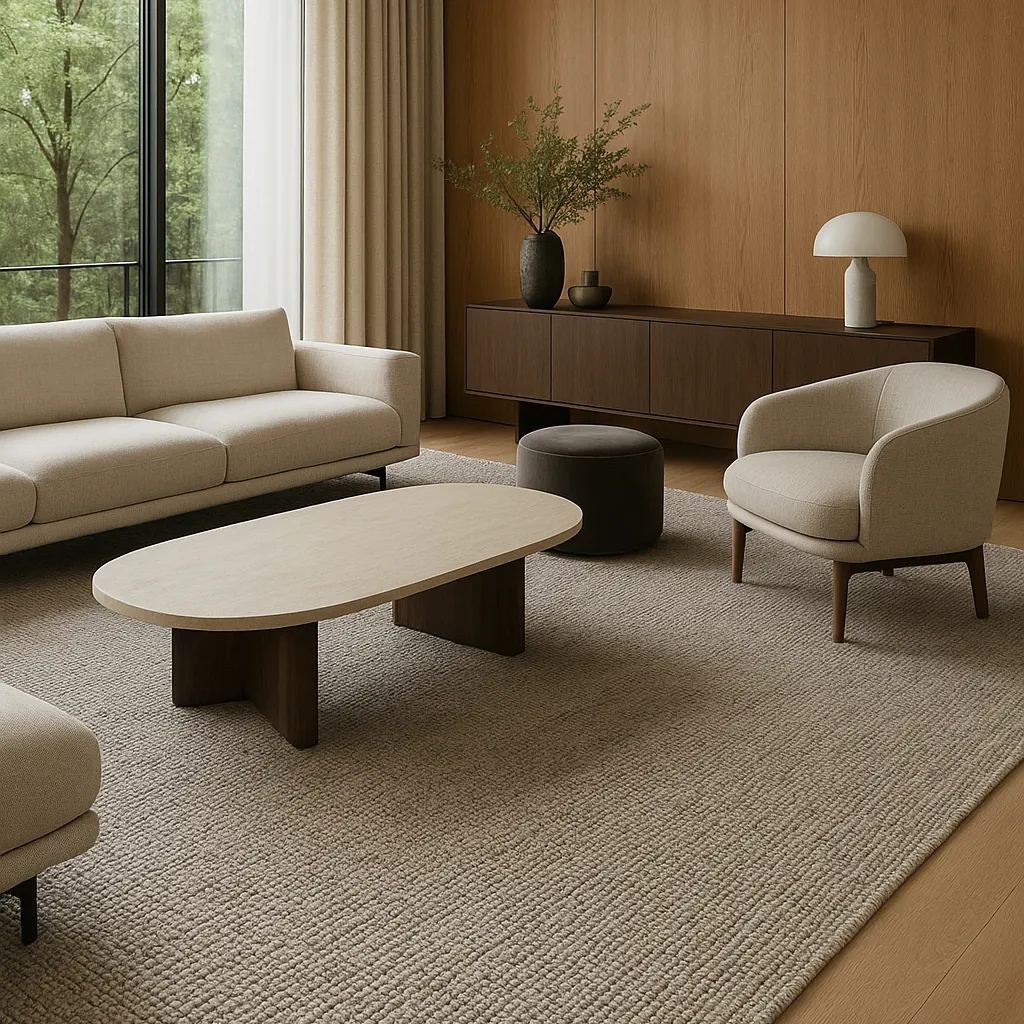 Open-plan lounges: grounds a sofa, armchairs and tables without visual clutter.