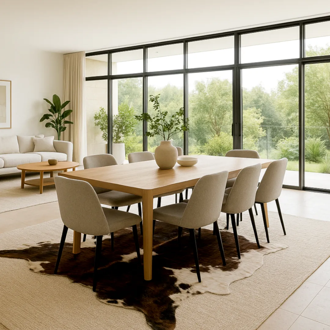 - Open-plan dining: Use an Nguni skin under a dining table to introduce organic shape within clean, modern lines.