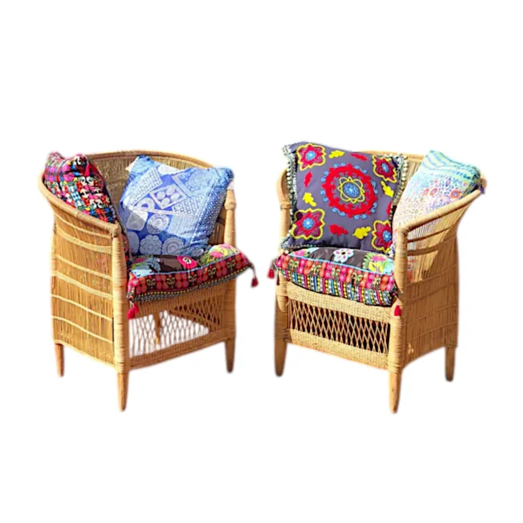 The traditional wicker chair bundle is made by hand in Malawi using natural cane and water reeds. Instead of glue, the frames are built using a traditional knotting method — the result is lightweight, strong, and full of detail. No two chairs are exactly the same, and that’s part of what makes this set feel more personal than anything mass-produced.