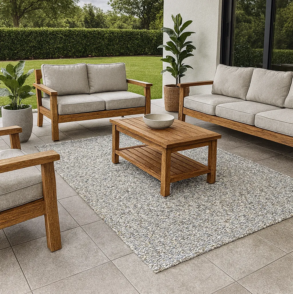 The Ficus Drift Outdoor Rug blends light and mid greys with soft, stone-like flecks, creating a versatile neutral that pairs easily with existing furniture. The subtle pattern reads as texture rather than a bold motif, so it supports your scheme instead of fighting with it.