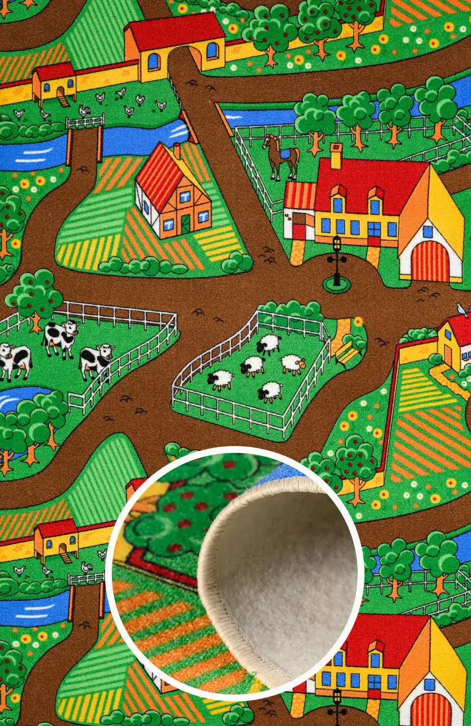 More than a decorative rug, Farmyard Adventures doubles as an interactive play mat. Children can drive toy cars along the lanes, visit the cows and sheep in their paddocks, or stop at the farmhouse on their way to the bridge. The clear, easy-to-read layout encourages open-ended play, helping little ones develop creativity, spatial awareness, and storytelling skills while they play on the floor.