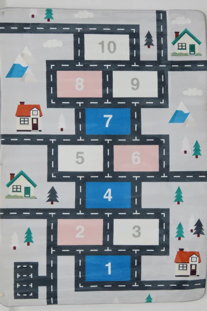 The Hopscotch Kids Rug transforms playtime into a delightful indoor adventure. Featuring a numbered hopscotch path with soft pastel blocks and a winding road border, it brings the familiar outdoor game to life inside the home. The charming details — from miniature houses to trees and mountain motifs — spark imagination while keeping the aesthetic calm and coordinated. This design encourages physical activity, making it ideal for rainy days or quiet afternoons indoors.