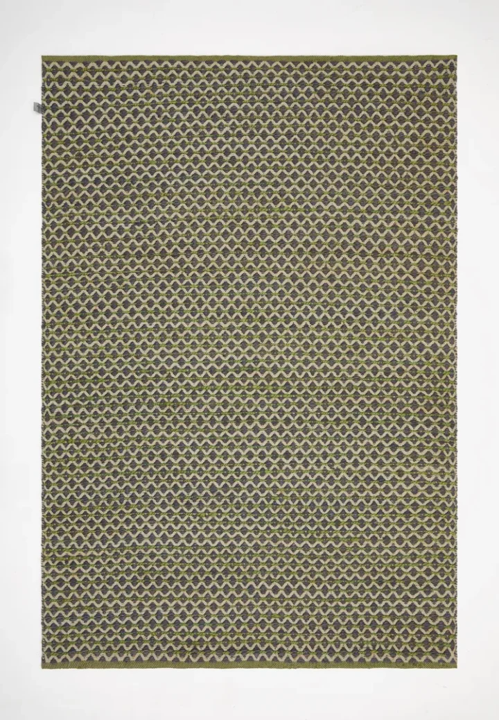 The Leapfrog Rug features a striking chevron pattern formed by grey diamond shapes set against a soft cream base, finished with uneven green stitching accents. This playful detail introduces movement and personality while maintaining a sophisticated, balanced aesthetic.
