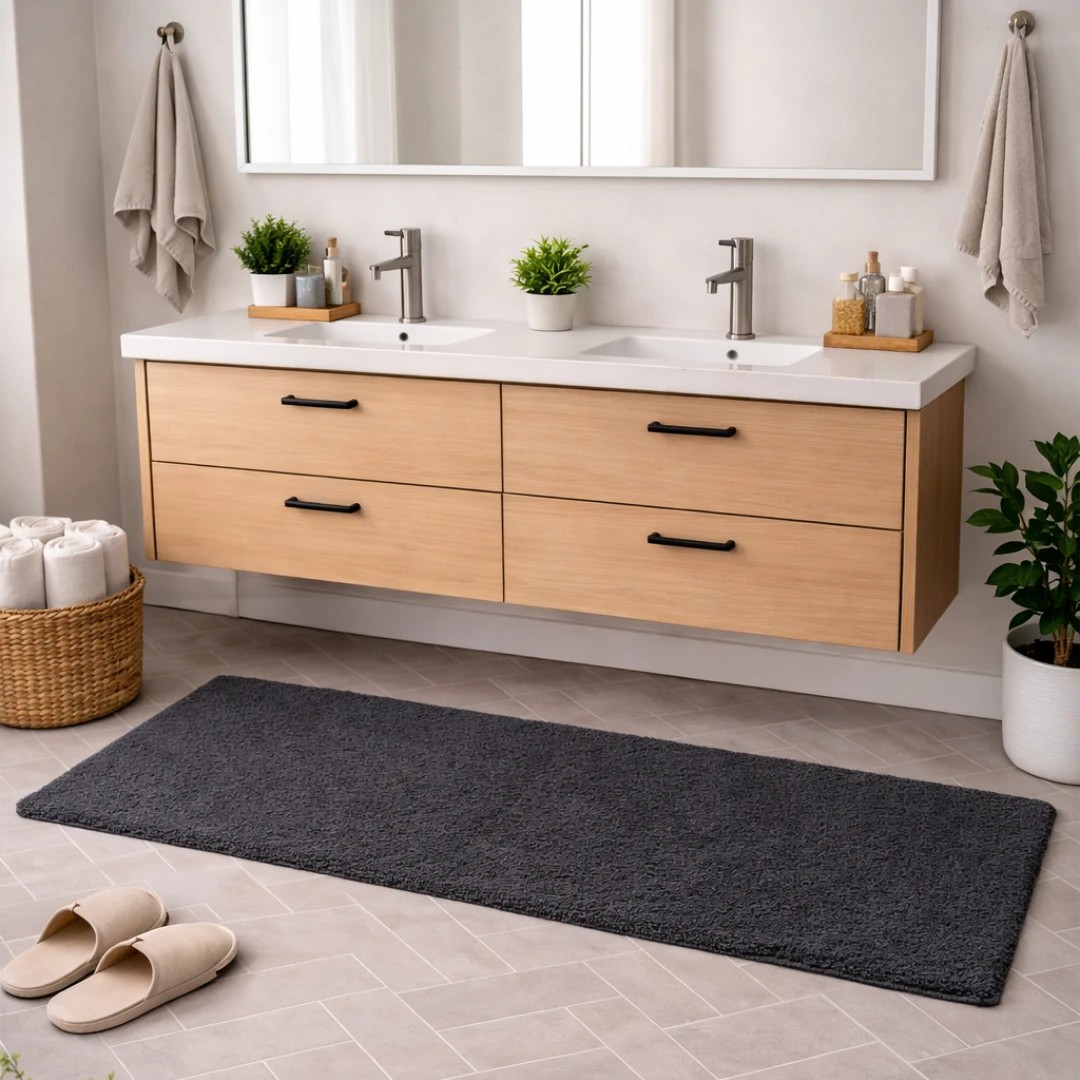 At 150 x 60cm, this bathroom mat offers a long, generous footprint that brings added comfort, visual balance, and a more luxurious feel to the room. It is especially well-suited to larger bathrooms where a longer mat can help anchor the space and create a more considered finish.