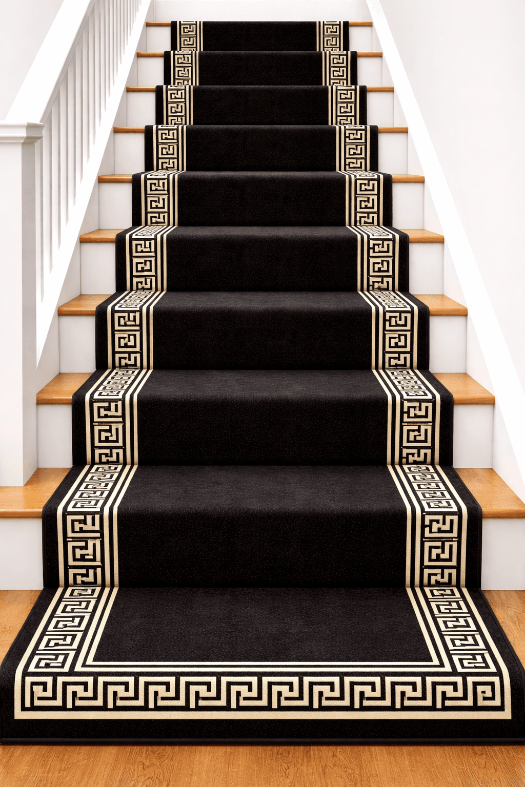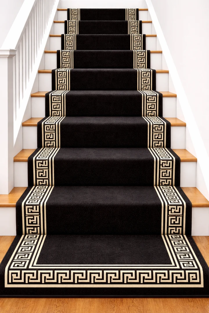 A Refined Stair Runner Inspired by Classical Greek Motifs, Symmetry & Timeless Contrast