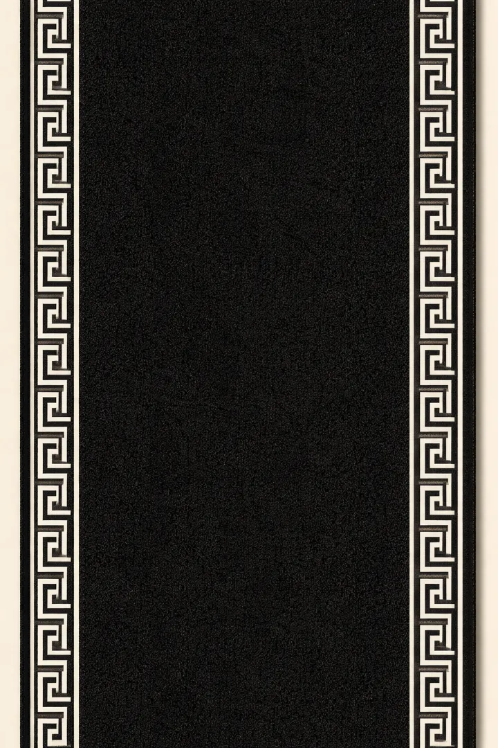 The rich black ground creates depth and drama, while the lighter border detail sharpens the design and highlights the Greek-inspired motif. This classic contrast makes the runner especially versatile, pairing beautifully with natural timber stairs, white-painted risers, black accents, brass finishes, and layered neutral interiors.