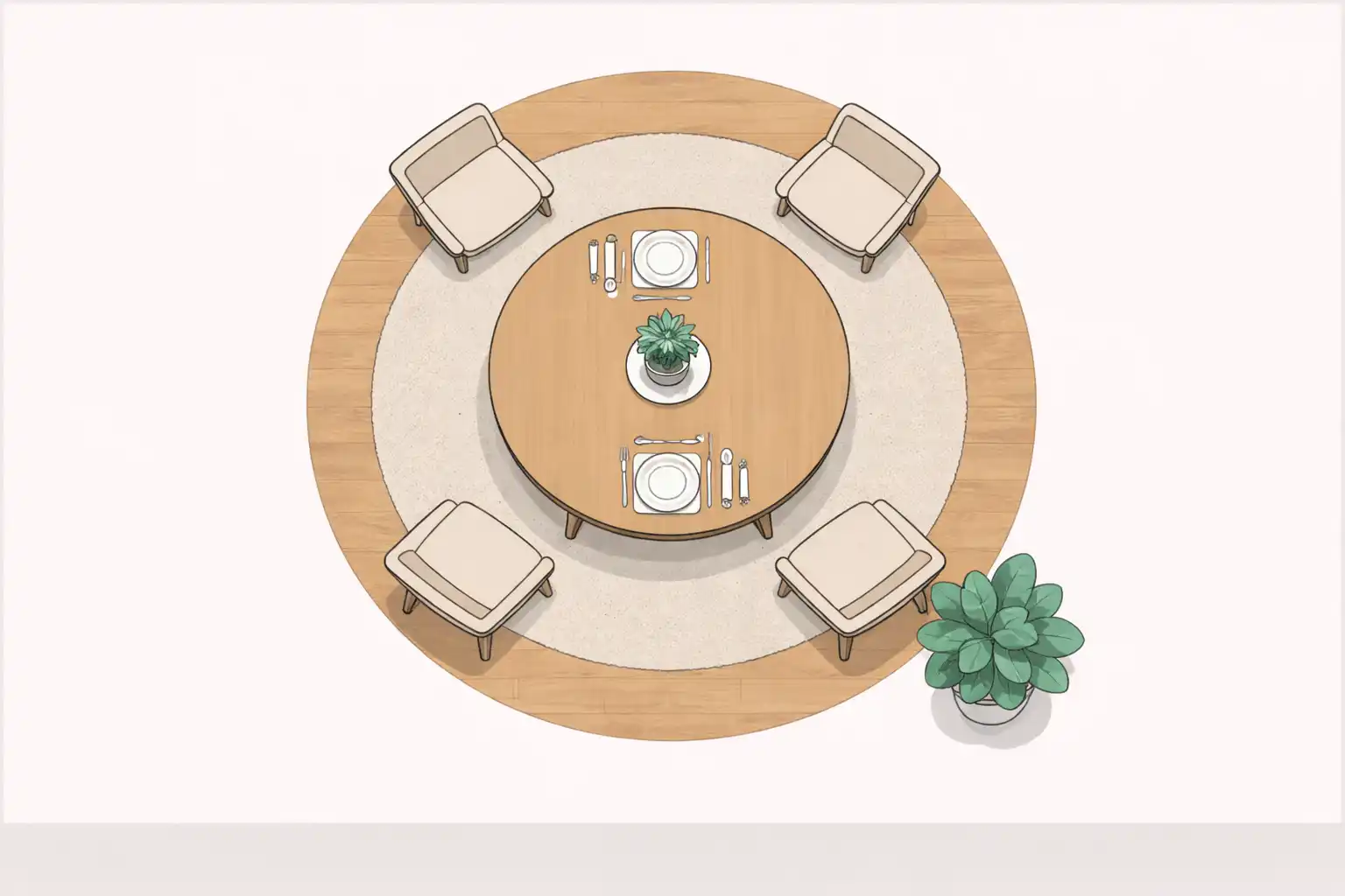 A dining rug must be large enough that chairs stay on the rug when pulled out. If chair legs drop off the edge, the layout feels awkward and edges can wear prematurely.