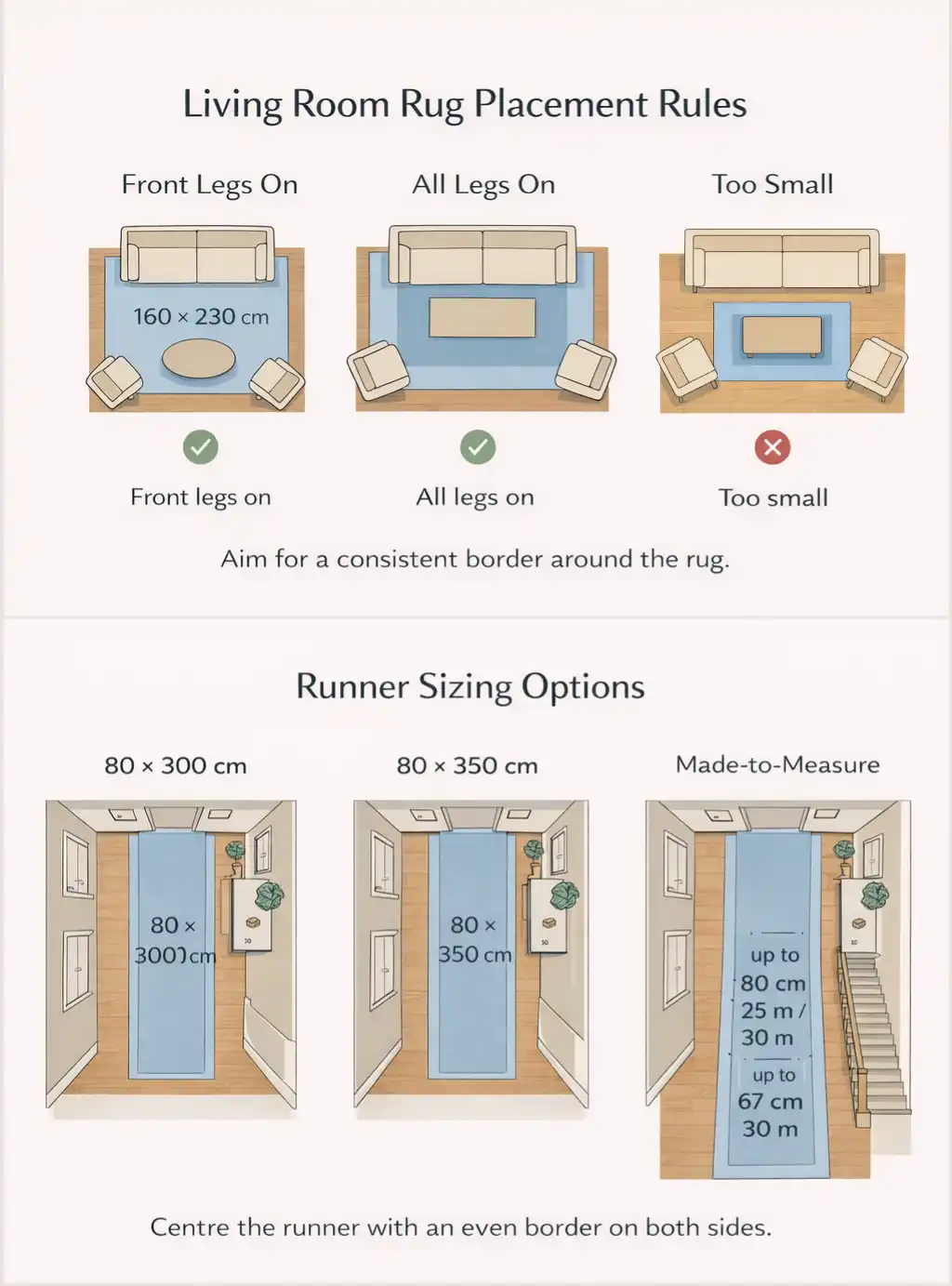 Choose a length that feels deliberate rather than “short and random”. If your hallway is longer than standard runner sizes, made-to-measure is usually the best solution for a seamless, tailored finish.